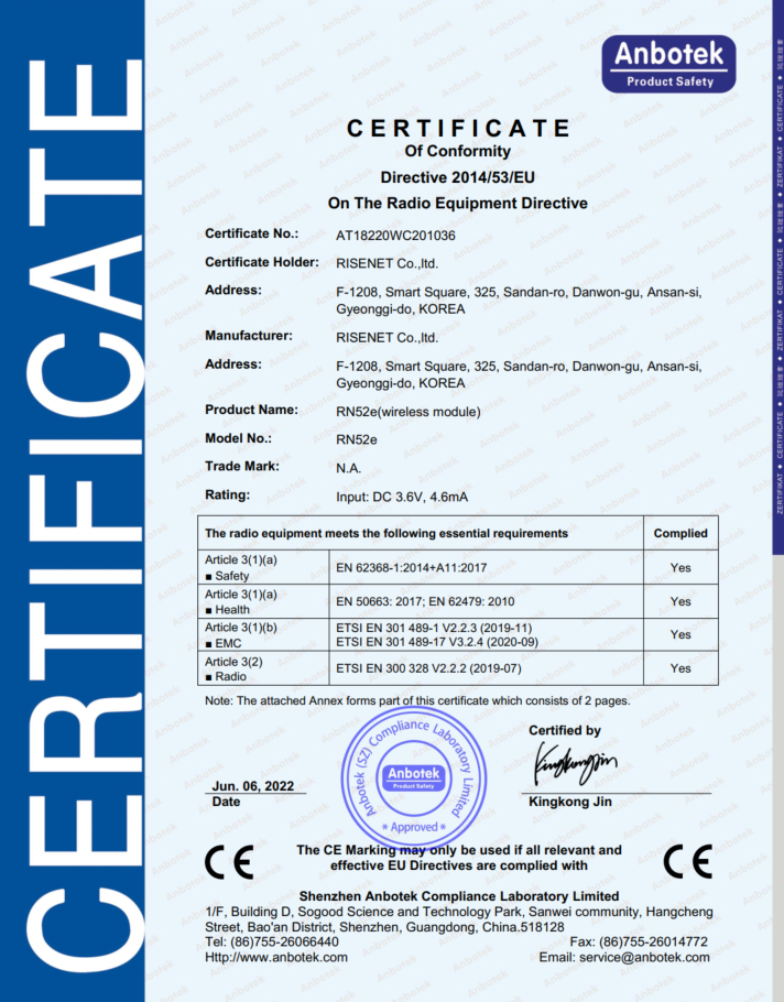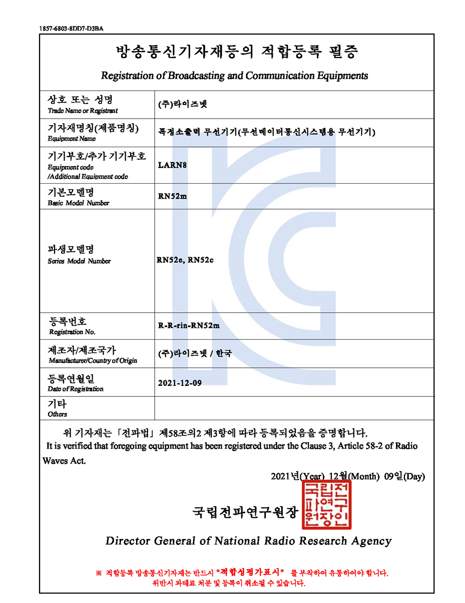 The RN52e module has completed KC, FCC, CE, RoHS certification.